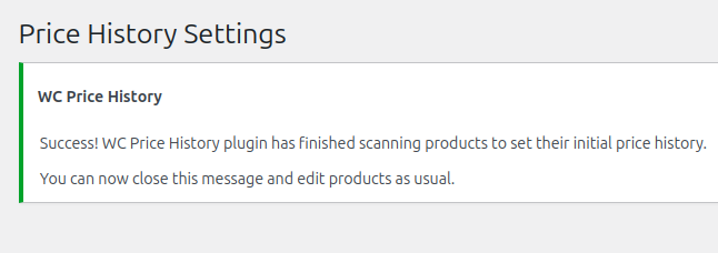 After the first installation of WC Price History you will see the notice informing you the plugin is scanning your products to initialize their prices’ history: